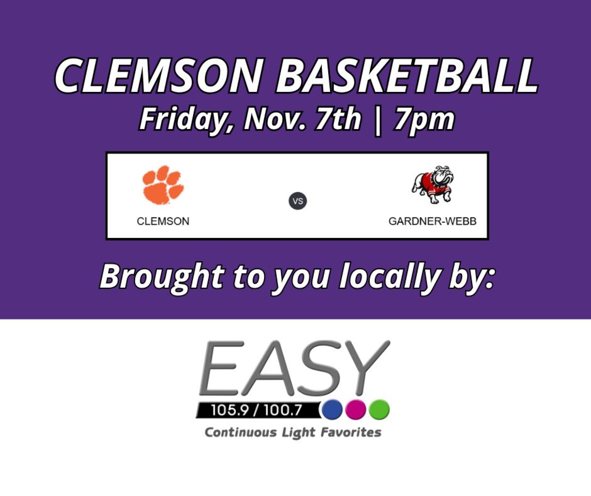 Clemson Basketball returns to EASY Radio on Friday, Nov. 7th at 7pm as they face off against Gardner-Webb.