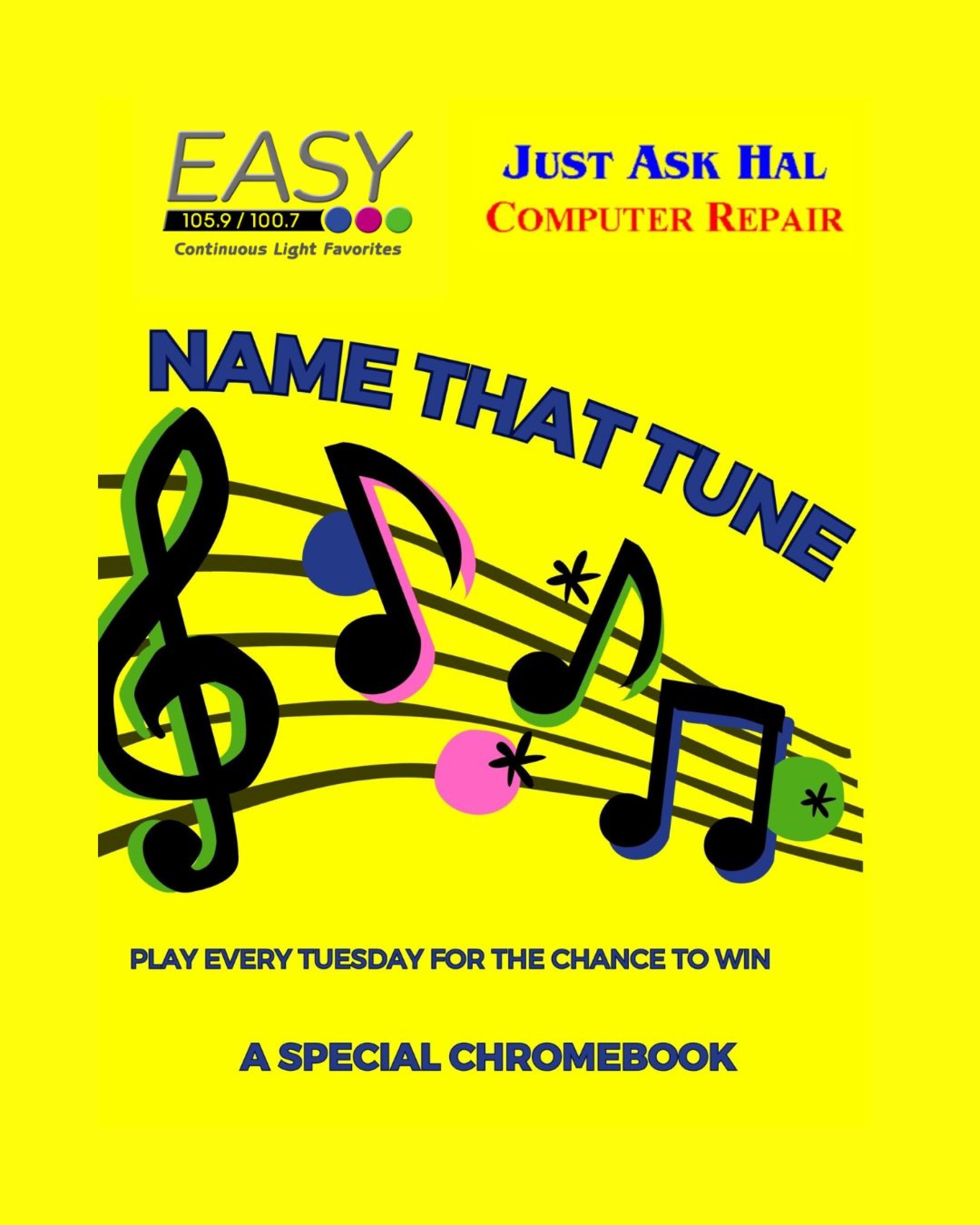 We're going to be giving away EVEN MORE like-new Chromebooks from Just Ask Hal through Name That Tune!