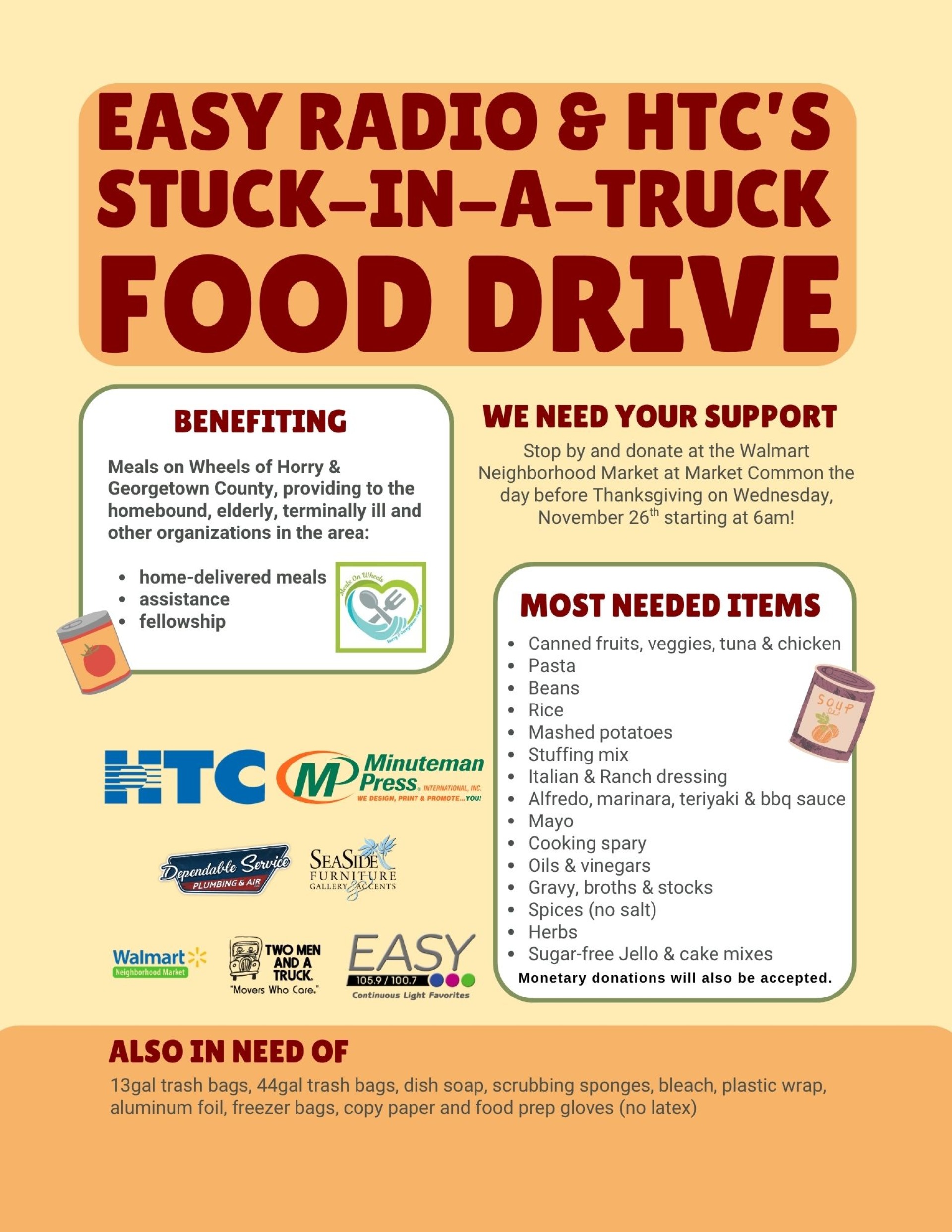 Support Meals on Wheels of Horry & Geogetown County (MOW) and their growing operations through the EASY Radio & HTC Stuck-In-A-Truck Food Drive, presented by Minuteman Press.