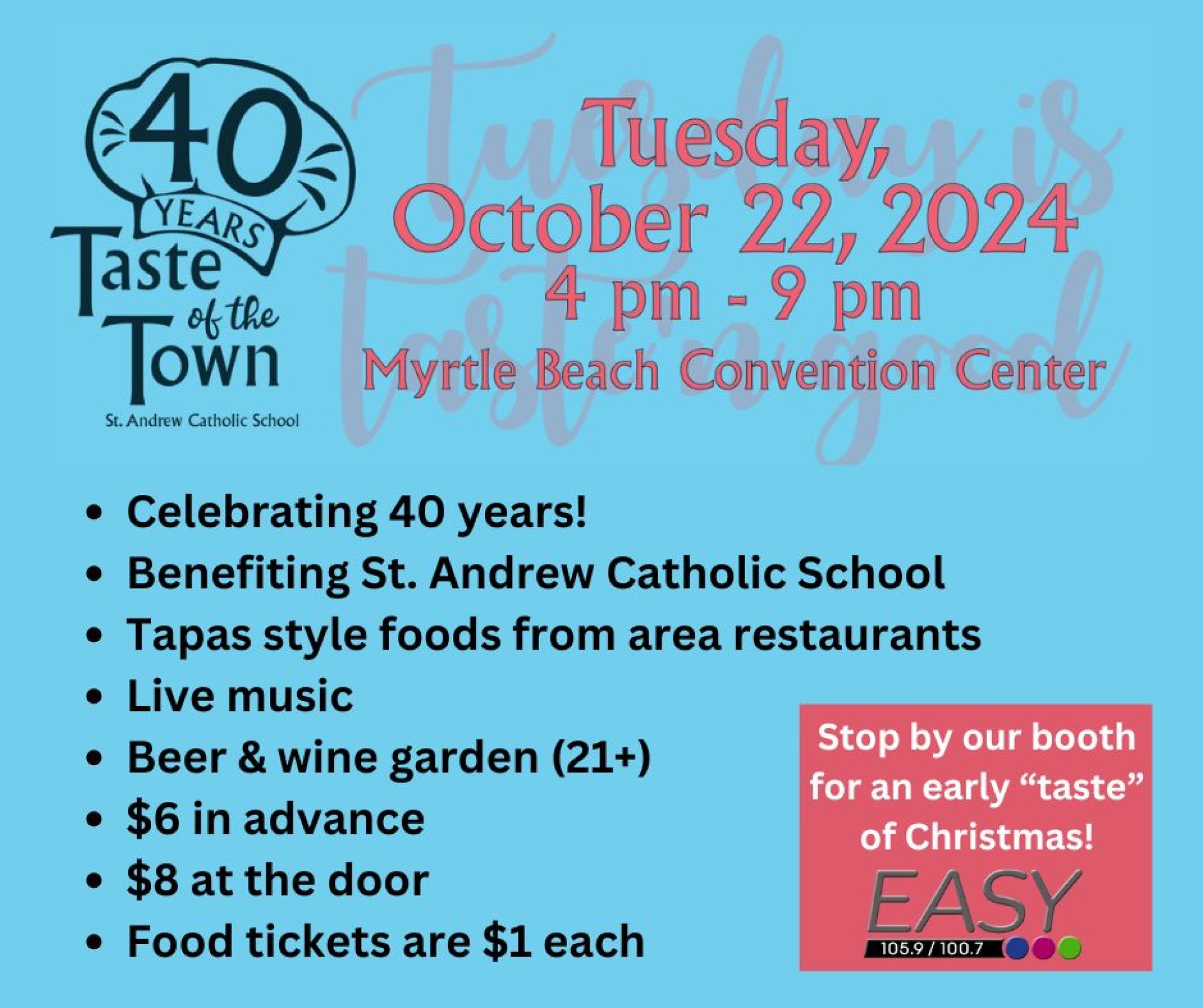 Taste of the Town, benefitting St. Andrew Catholic School, returns to the Myrtle Beach Convention Center on Tuesday, November 4th from 4pm to 9pm.